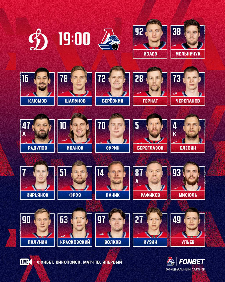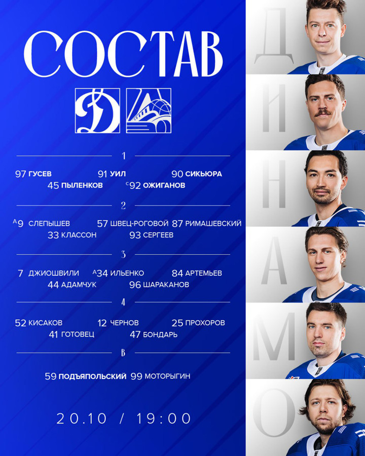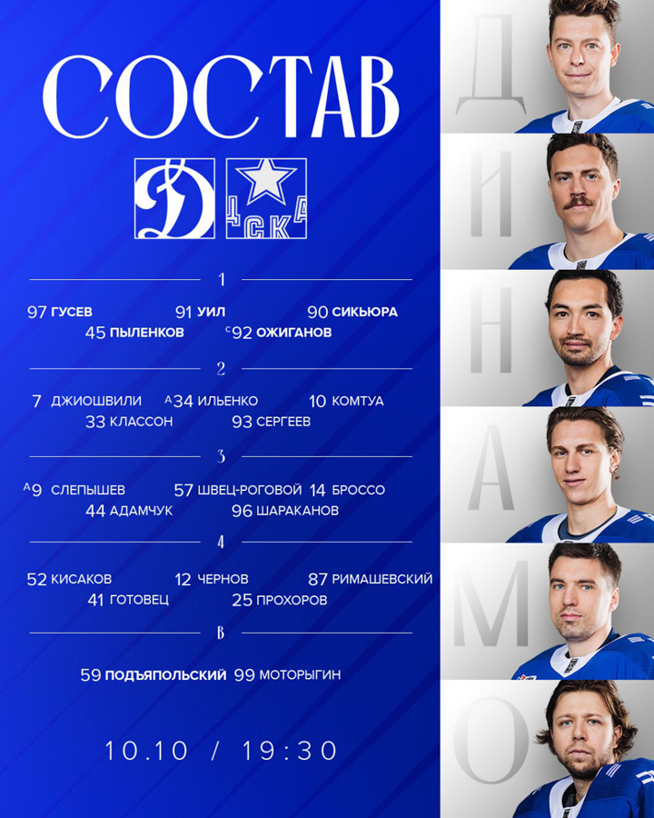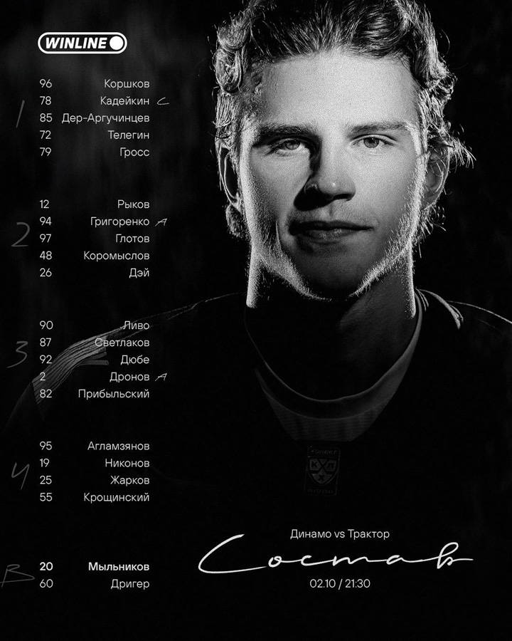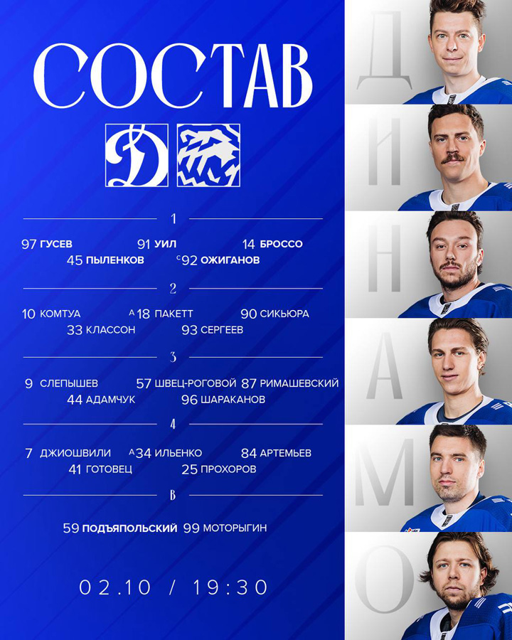 Олсон, Шестаков, Петухов – Комтуа (1, ПБ), Уил, Броссо22.09.2025 Амур Хабаровск – Динамо Москва – 1:3 (0:1, 0:1, 1:1)
