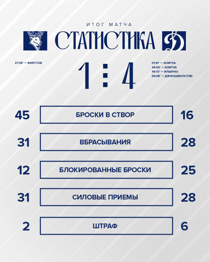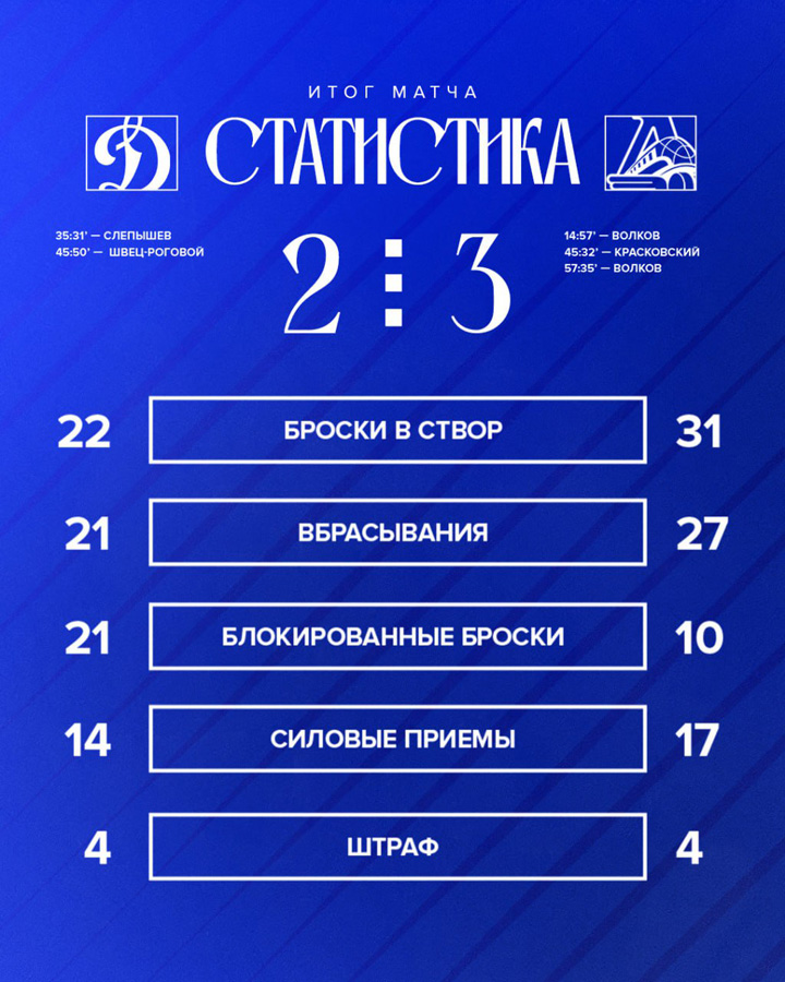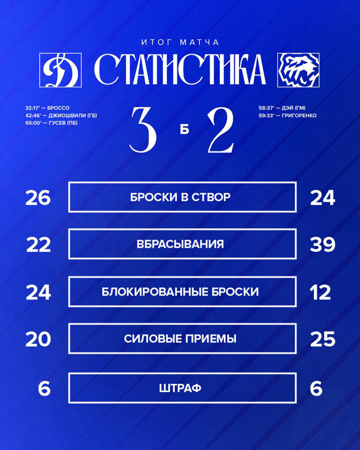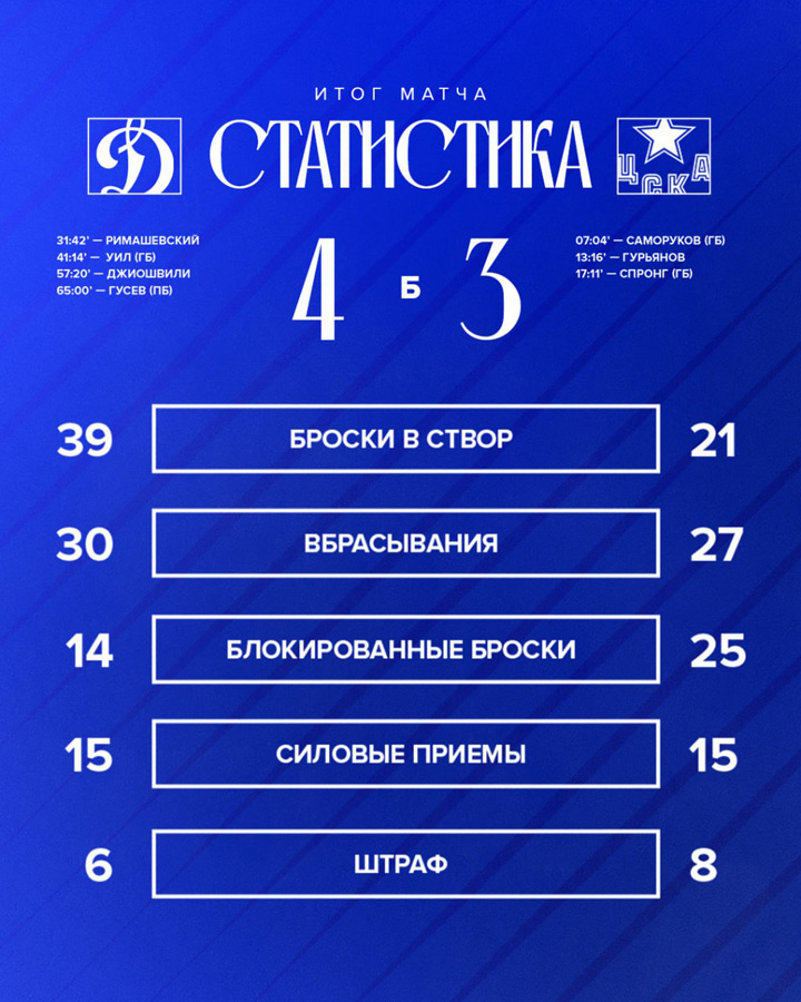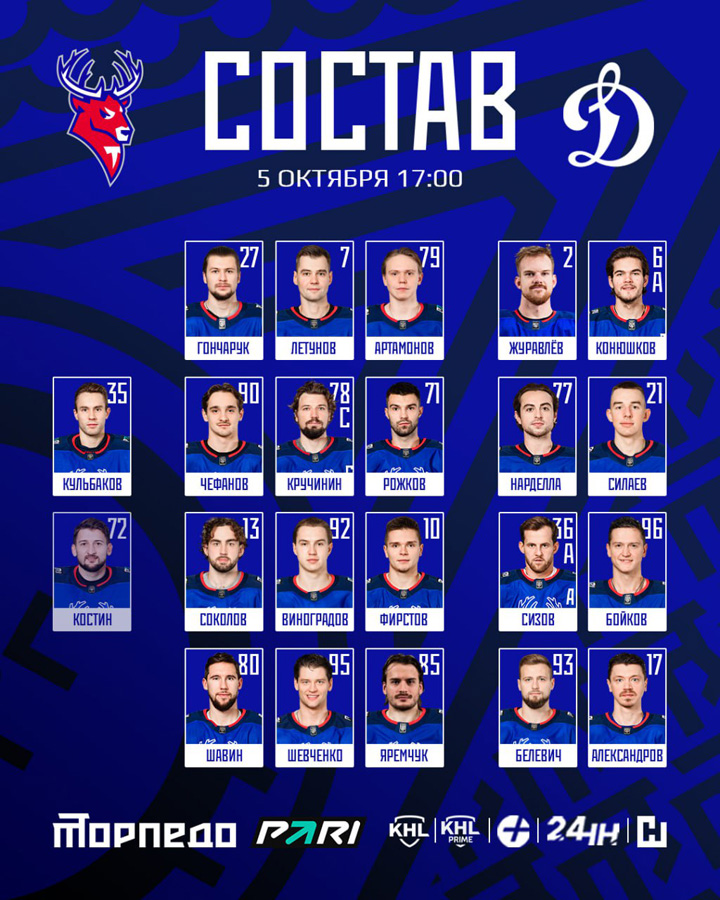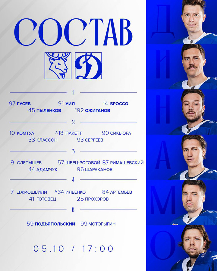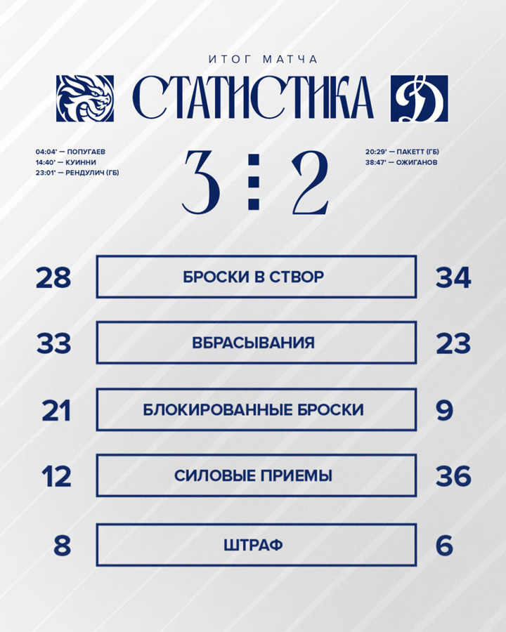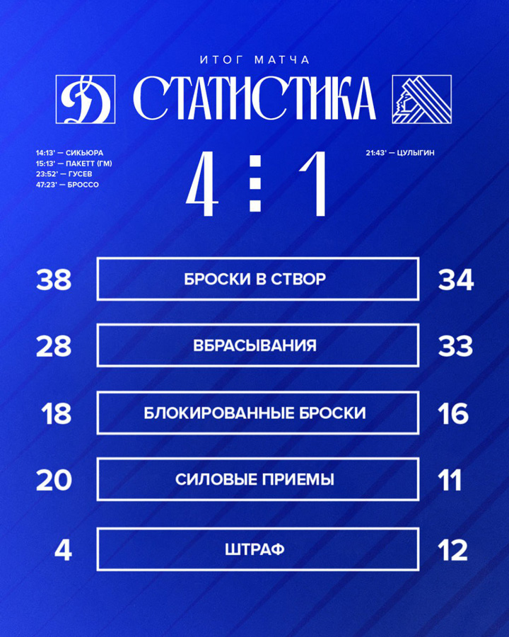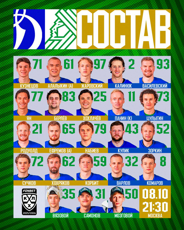 Шайхмедденов, Колесников, Веккьоне (2), Омирбеков – Комтуа, Гусев20.09.2025 Адмирал Владивосток – Динамо Москва – 3:4 Б (1:0, 2:2, 0:1, 0:0, 0:1)