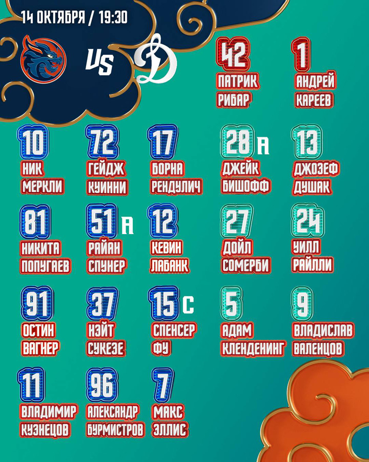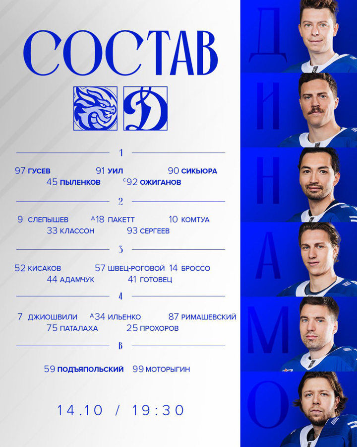 Гальченюк – Гусев, Броссо, Комтуа24.09.2025 Динамо Москва – Шанхай Дрэгонс – 3:2 ОТ (2:2, 0:0, 0:0, 1:0)