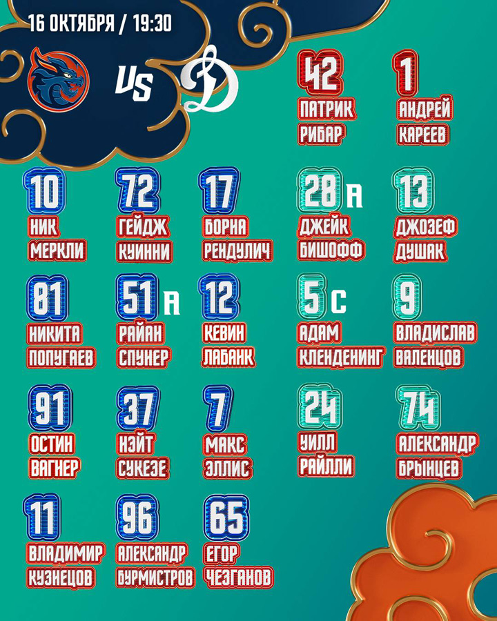 Прохоркин (3), Шарипзянов, Рашевский, Волков, Фьоре – Пакетт, Уил, Ожиганов, Швец-Роговой15.09.2025 Барыс Астана – Динамо Москва – 5:2 (0:1, 2:0, 3:1)