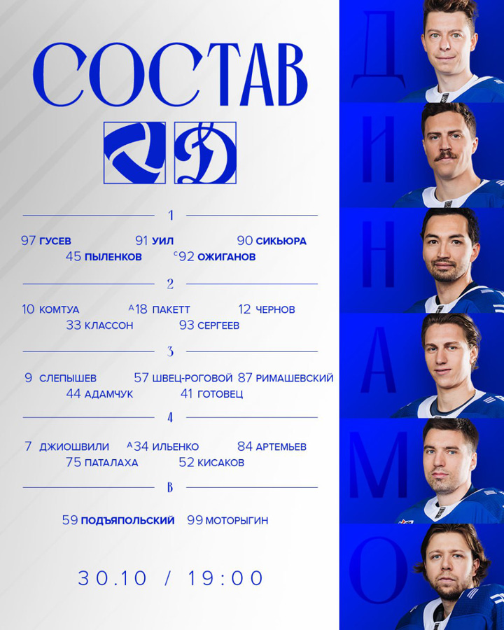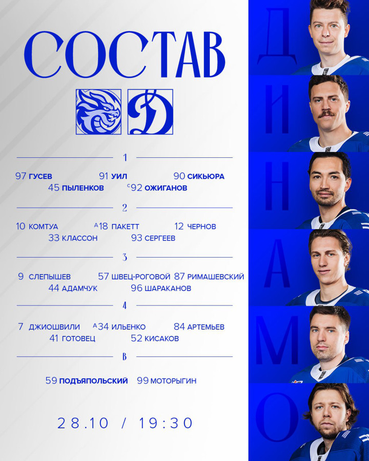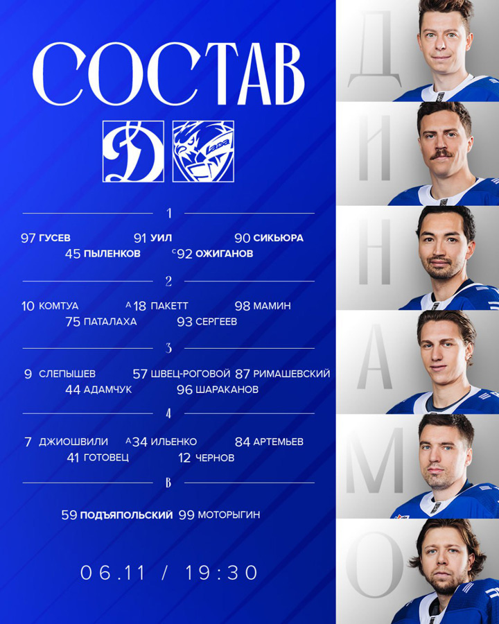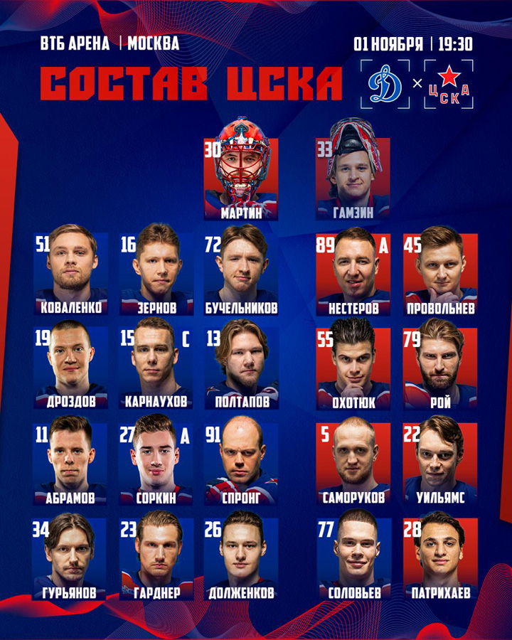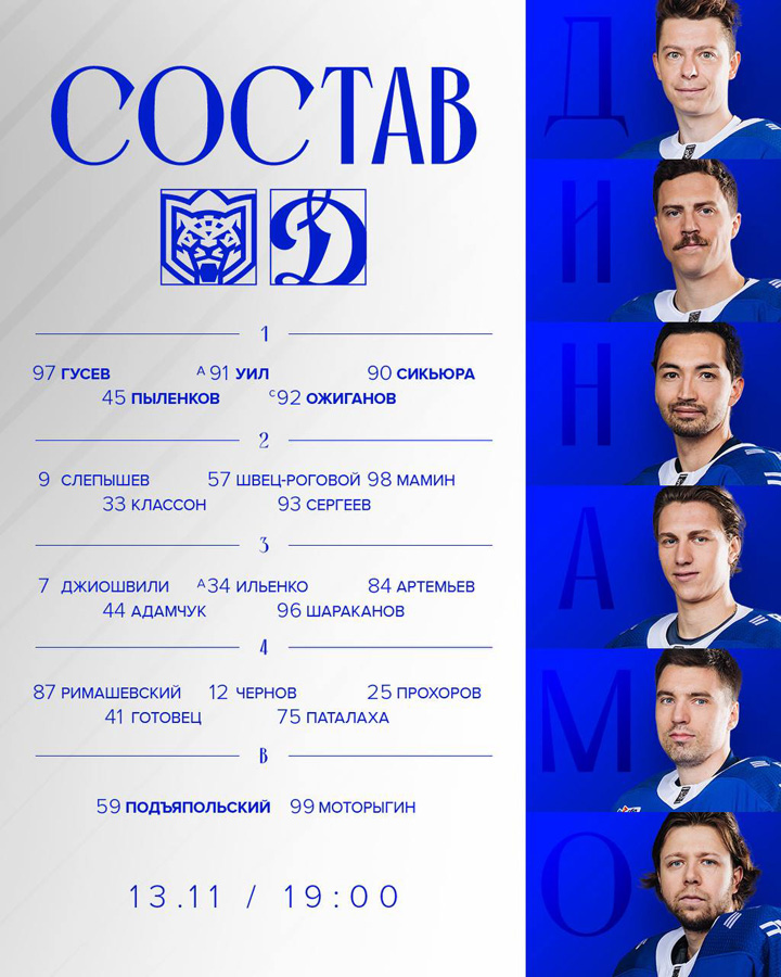 06.09.2025 В стартовой игре сезона с московским ЦСКА (2:6) в составе московского «Динамо» дебютировали защитник Фредрик Классон, а также нападающие Девин Броссо и Максим Мамин. Впервые на тренерском мостике оказались тренеры Ильнур Гизатуллин и Геннадий Столяров.