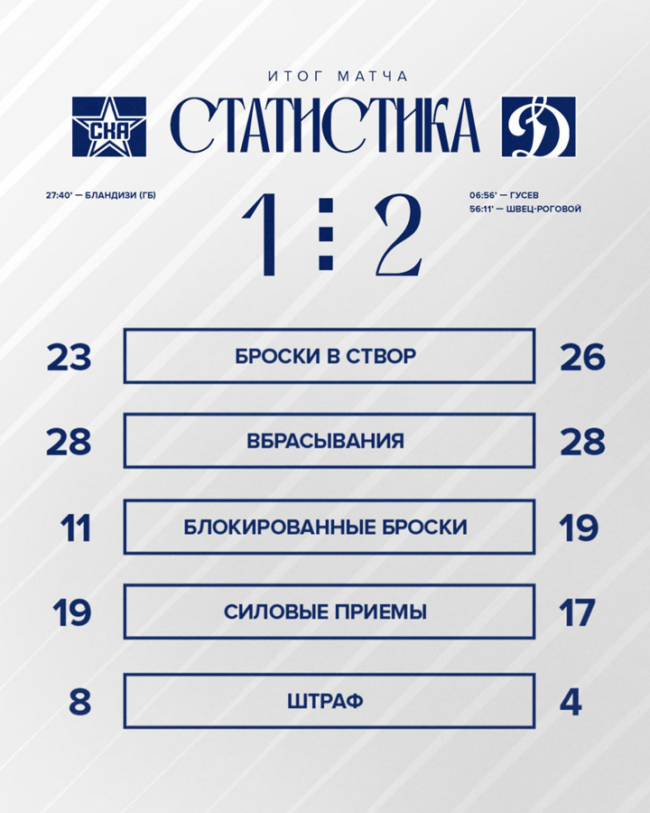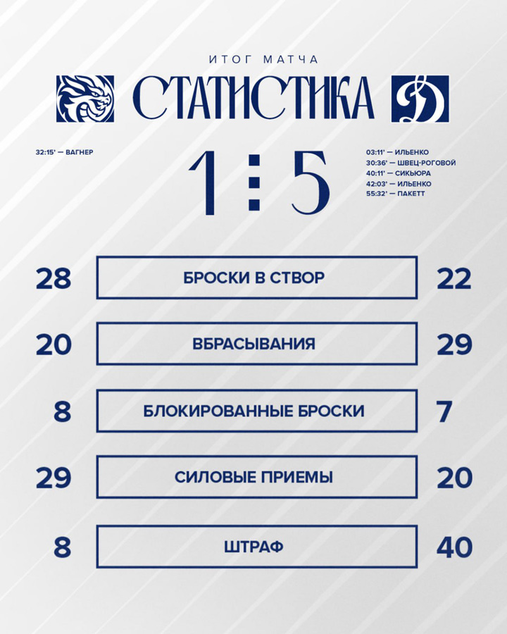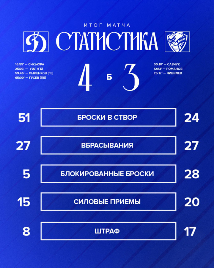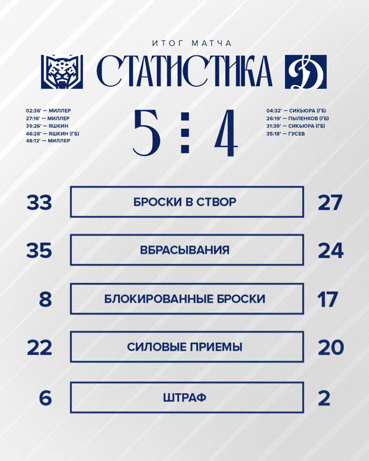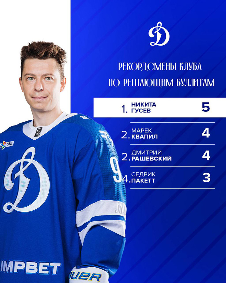 02.10.2025 В игре с челябинским «Трактором» (3:2 Б) нападающий Никита Гусев в пятый раз принёс московскому «Динамо» победу в сериях послематчевых бросков, и установил клубный рекорд в высшем дивизионе, превзойдя достижение Марека Квапила и Дмитрия Рашевского (по четыре). - Результаты