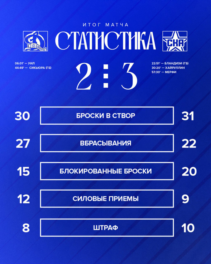 Шайхмедденов, Колесников, Веккьоне (2), Омирбеков – Комтуа, Гусев20.09.2025