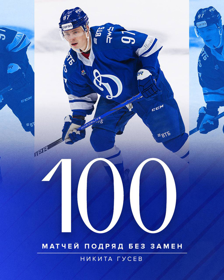02.10.2025 В игре с челябинским «Трактором» (3:2 Б) нападающий Никита Гусев провёл 100-й матч подряд за московское «Динамо» и стал членом символического «Клуба Бориса Петелина».