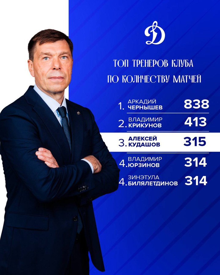 06.09.2025 Игрой с московским ЦСКА (2:6) главный тренер Алексей Кудашов начал 5-й сезон в московском «Динамо» и установил клубный рекорд в КХЛ, превзойдя достижение Олега Знарка (4).