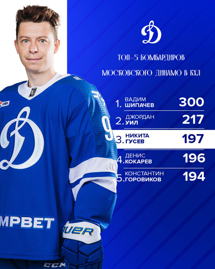 11.09.2025 В игре с магнитогорским «Металлургом» (2:1 Б) нападающий Никита Гусев в четвёртый раз принёс московскому «Динамо» победу в сериях послематчевых бросков, что отныне является повторением клубного рекорда в высшем дивизионе, который ранее принадлежал Мареку Квапилу и Дмитрию Рашевскому.
