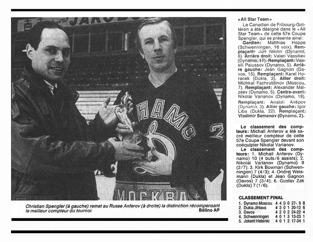 Давос - Йокерит Хельсинки - 10:4 (4:2, 3:1, 3:1)Команда И В Н П Ш О 1 ДИНАМО Москва, СССР 4 4 0 0 27-9 8 2 Дукла Йиглава, Чехословакия 4 3 0 1 20-13 6 3 Давос, Швейцария 4 1 0 3 24-22 4 4 Швеннинген, ФРГ 4 0 1 3 13-23 1 5 Йокерит Хельсинки, Финляндия 4 0 1 3 17-34 1
